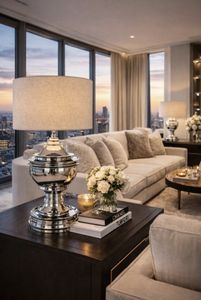 Bordlampe Spring Hill 28x53Cm Black Nickel med sandfarget skjerm