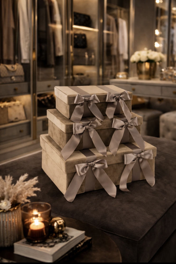 Sett med 3 Tekstil bokser Fløyel /Sateng Beige sett a 3.