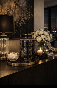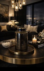 Flott krukke i porselen med fint mønster i gull og svart H:31 B:18